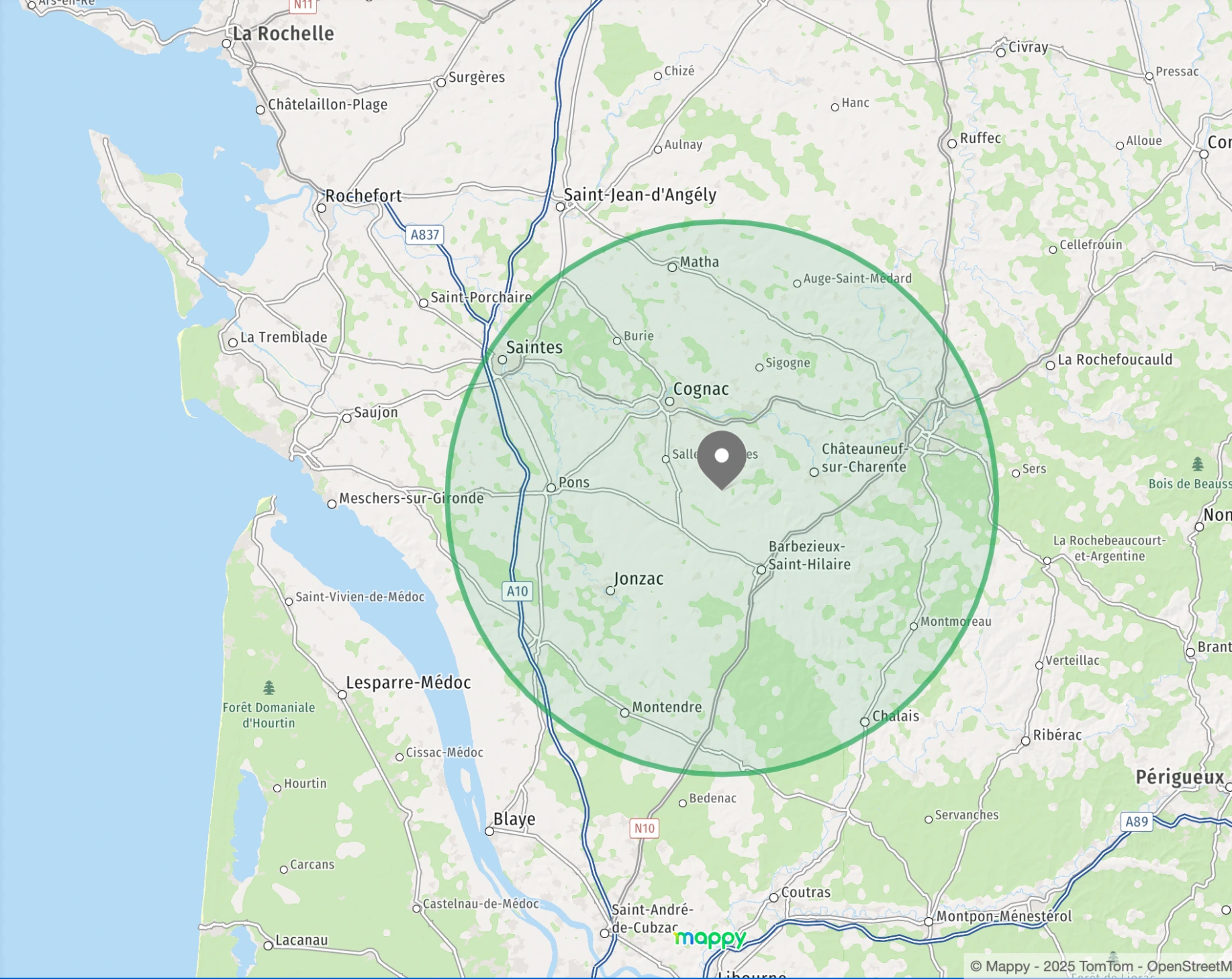 En dehors du rayon d’intervention (cercle vert), un supplément pourra être facturé. Un devis devra être signé avant l'accompagnement.